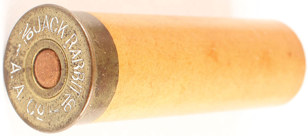 H/S= ''Jack Rabbit A.A.Co. No 16'' 2 1/2'' OAL, empty tan paper case. Grade: Very Good + - Value: 6 to 30