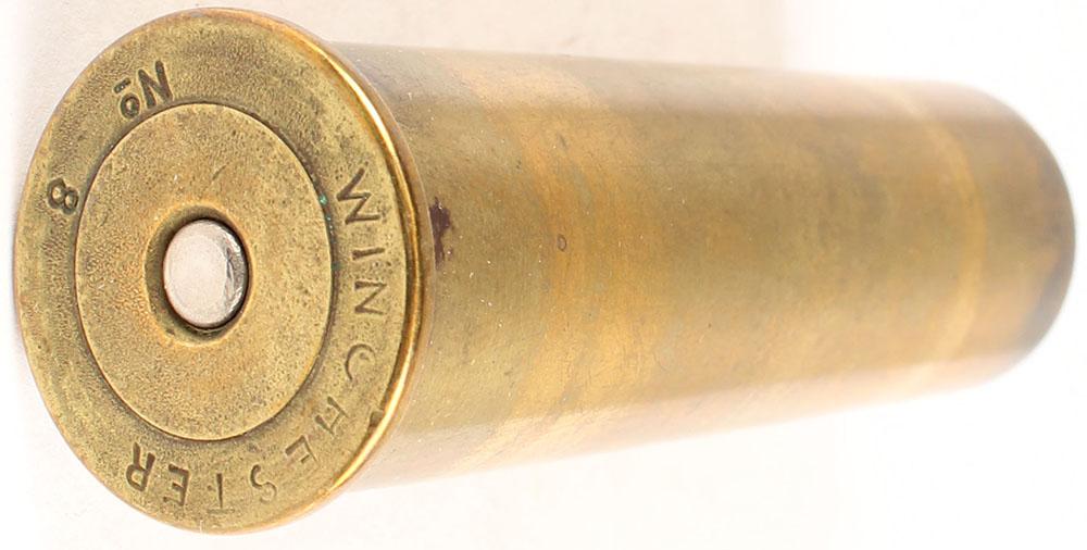 H/S= '' Winchester No 8'' 3 5/16'' OAL, loaded brass shotshell. Grade: Very Good + - Value: 10 to 50