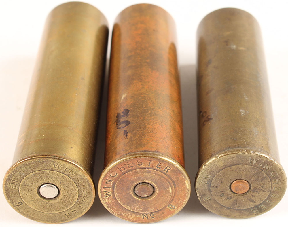 | Lot of 3 H/S= ''Winchester No 8'' loaded brass shotshells. ...