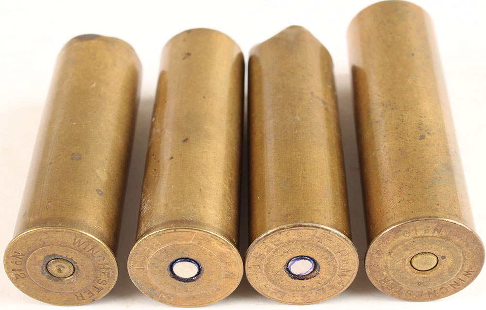 Lot of 4 (2) H/S= ''REM-UMC No 12 BEST'' 2 5/8'' OAL, loaded brass. (1) H/S= ''Winchester No 10'' 2 7/8'' OAL, empty brass. (1) H/S= ''Winchester No 12'' 2 1/2'' OAL, empty brass. Grade: Very Good - Value: 6 to 30