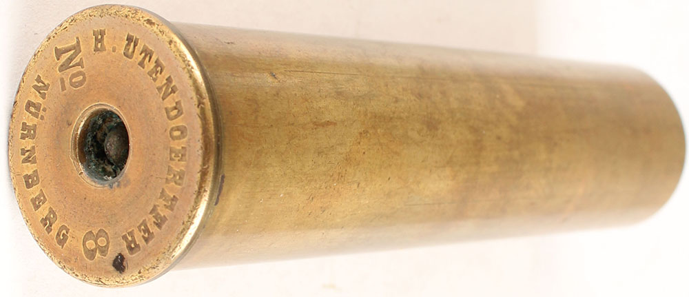H/S= ''H. Utendoerffer No 8 Nurnberg'' 3 15/16'' OAL, empty brass shotshell. Grade: Very Good + - Value: 10 to 80