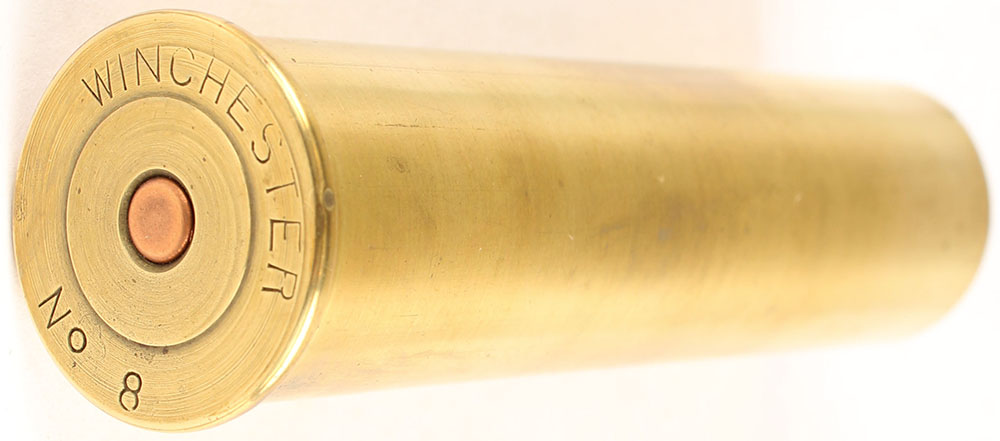 H/S= ''Winchester No 8'' 3 1/2'' OAL, empty brass shotshell. Grade: Excellent - Value: 10 to 80