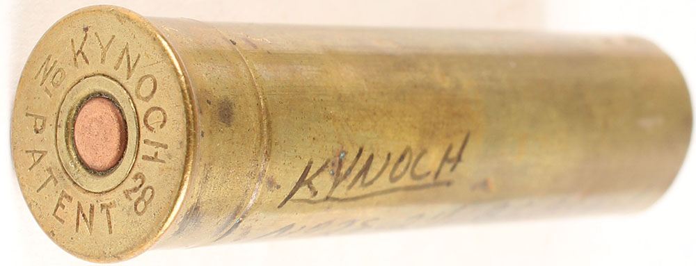 H/S= ''KYNOCH Patent No 28'' 2 1/2'' OAL, empty brass shotshell. Grade: Very Good + - Value: 10 to 50
