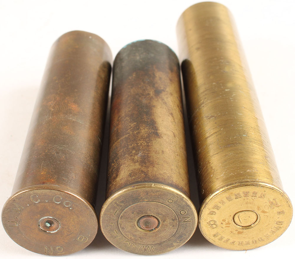 | Lot of 3 empty brass shotshells, mixed H/S, 8ga. Grade: Very Go...