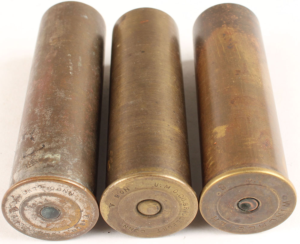 Lot of 3 mixed H/S, 8ga brass shotshells, 1 is full, 2 are empty. Grade: Very Good - Value: 10 to 80