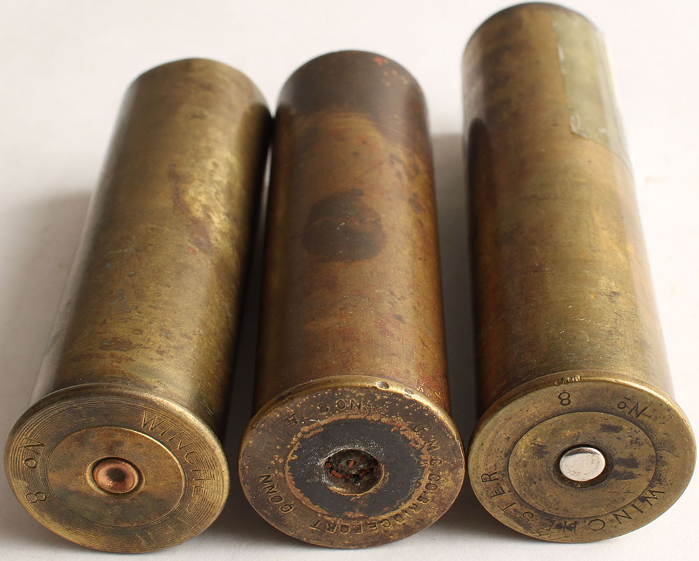 Lot of 3 mixed H/S, 8 gauge, empty brass shotshells. Grade: Very Good - Value: 10 to 80