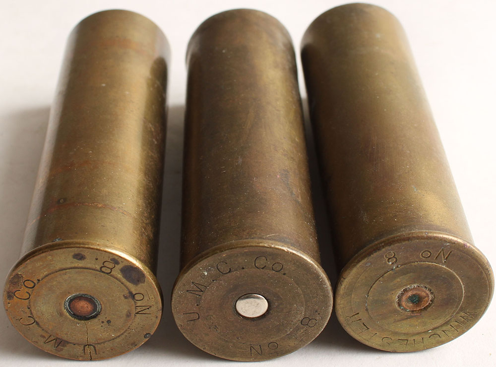 Lot of 3 mixed H/S, 8 gauge, empty brass shotshells. Grade: Very Good + - Value: 10 to 80