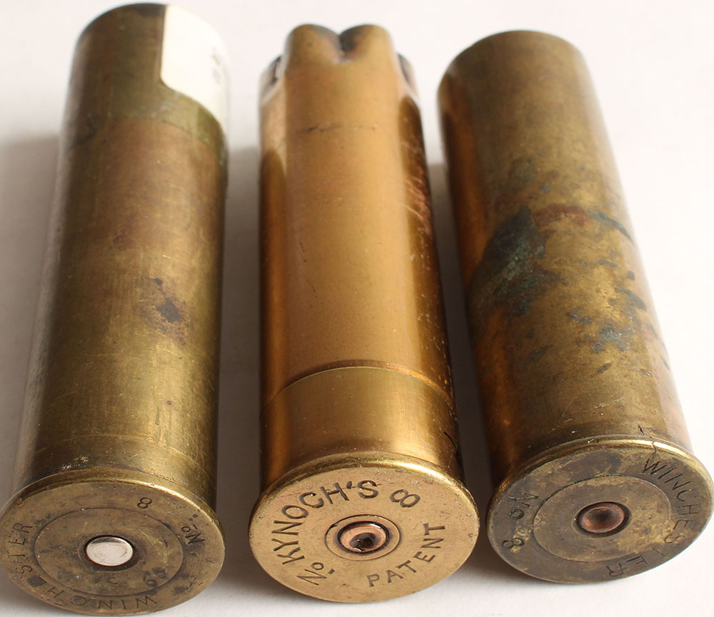 Lot of 3 mixed H/S, 8 gauge, empty brass shotshells. Grade: Very Good - Value: 10 to 80