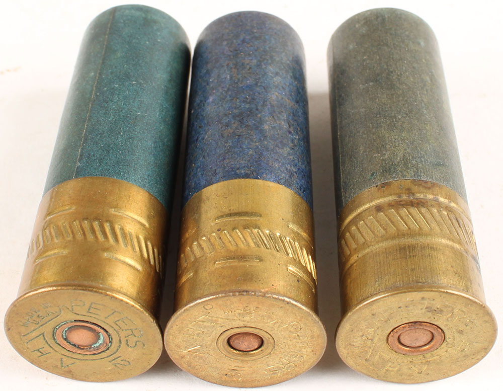Lot of 3 Peters H.V. 12ga, loaded blue paper cases. Grade: Very Good ++ - Value: 10 to 100
