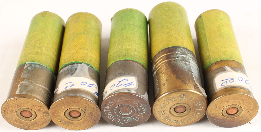 Lot of 5 H/S= ''Lightning U.M.C.CO. mixed gauges, loaded green paper cases. Grade: Very Good + - Value: 4 to 50