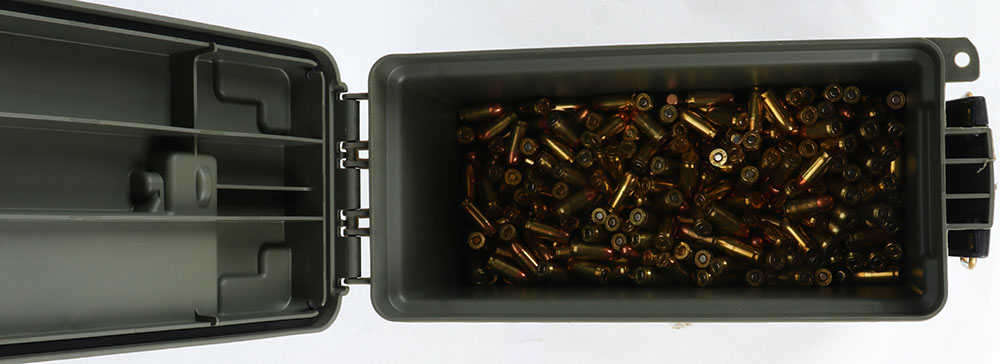 Plastic ammo can, Half full of Mix H/S .380 auto, mix of FMJ & Hollow point, Approx 250 Rds., ammo is excellent. Grade: Excellent - Value: 100 to 200