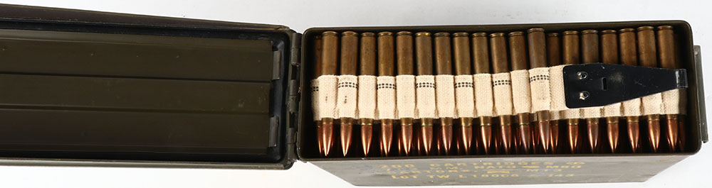 M19A1 ammo can full of Approx 250 Rds. Of .30-06 on a cloth belt, ammo is excellent. Grade: Excellent - Value: 250 to 400
