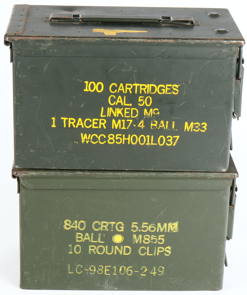Lot of 2, M2A1 .50 Cal Military ammo cans, Both empty, Insides of the cans are clean with no rust. Grade Very good ++ - Value: 20 to 40