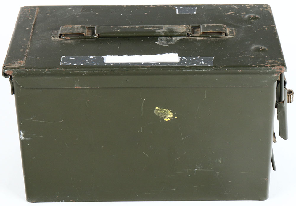 M2A1 .50 cal ammo can, Empty, inside is clean with no rust, has been modified to take a lock. Grade: Very Good ++ - Value: 10 to 30
