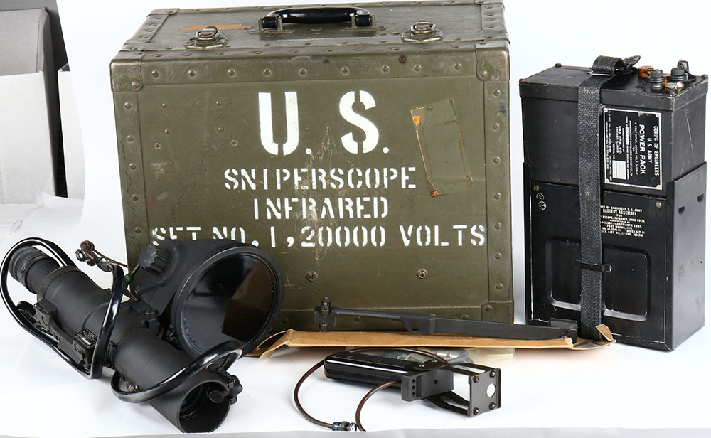 US, M3 Infrared Sniperscope with case, battery pack, foregrip & other accessories, This is one of the earliest iterations of Infrared scope, the name Sniperscope in the Official documents was to hide the fact that it was a Infrared scope because it was not a true ''Sniper'' scope, it was designed to help spot targets at night, it was designed to be mounted on the M1 Carbine & it could be used by night sentry's to lookout for night time raids & also be used to direct machine gun & rifle fire at night with tracers. Side plate on scope is marked ''CORPS OF ENGINEERS U. S. ARMY'', ''TELESCOPE'', ''SNIPERSCOPE, INFRARED, 20,000 VOLTS'', ''AMERICAN OPTICAL CO.'', ''BUFFALO, N.Y.'', ''P.O. NO 27-43200-03 DATED 6-23-51'', ''SERIAL NO. M3. 7739 .51'', ''STOCK LIST NO. 19-8416,500-200''. Scope is excellent with only miner scratches/wear, scope is untested & not know if it works. Grade: Excellent - Value: 600 to 1200