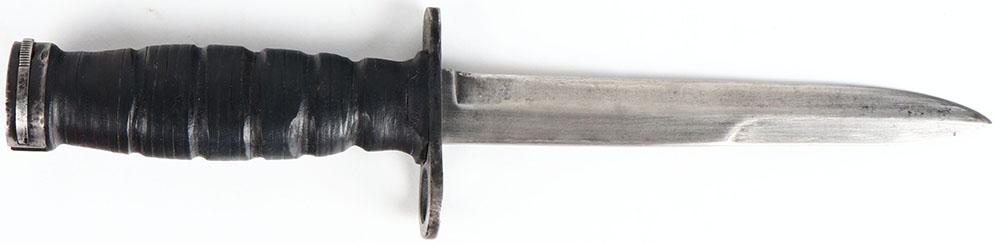 US, M4 bayonet, Made by W.R. Case & Sons Cutlery Co, grips is made of stacked leather washers, top of guard is marked with a flaming bomb, ''US.M4'', ''CASE'', grip & blade show heavy wear from use. Grade: Very Good - Value: 80 to 160