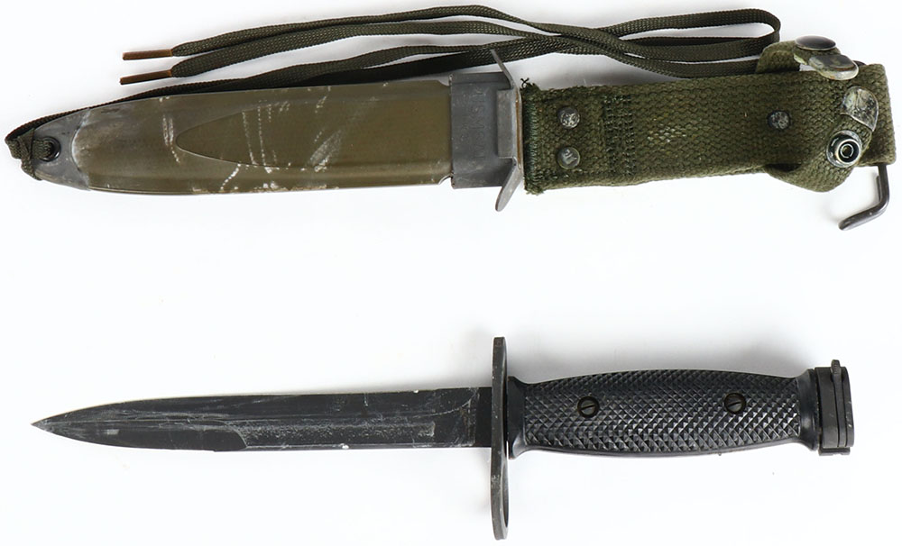 US, M7 Bayonet, made by Imperial Knife Co., top of guard is marked ''U.S. M7'', ''IMPERIAL'', comes with a M8A1 sheath/frog. Grade: Very Good + - Value: 70 to 140
