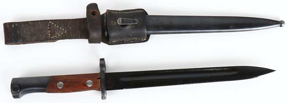 Yugoslavia, M1948 Bayonet, right side of blade is marked in Cyrillic that reads ''PREDUZECE'' which translates to Factory, & ''44'', right side of guard is marked ''81468'', blade has orginal grease from either factory or refurbishment, comes with orginal S/N matched sheath & frog. Grade: Very Good + - Value: 40 to 100