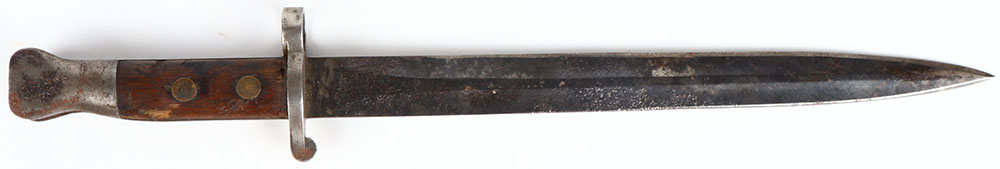 British, Pattern 1888 Bayonet MK 1 type 2, left side of blade is marked with a crown over ''V.F.'', & has proof marks, blade has, wear from sharpening, patina & light rust spots, & cleaned pitting spots. Grade: Very Good - Value: 30 to 100