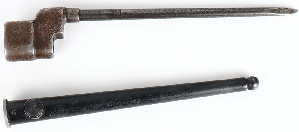 British, No4 mk2* Spike bayonet, right side of base is marked ''FF 81'', comes with sheath. Grade: Very Good + - Value: 40 to 80