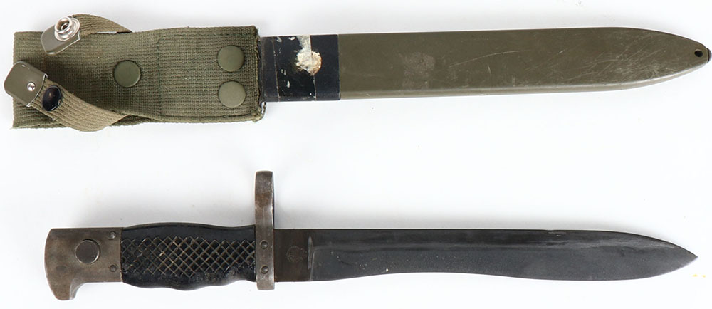 Spanish, M1964 CETME Model C bayonet, left side of blade is marked with the IMI logo & ''ET651D'', right side of blade is marked Toledo Coat of Arms, blade has caked on grease, comes with sheath/frog. Grade: Very Good + - Value: 30 to 90