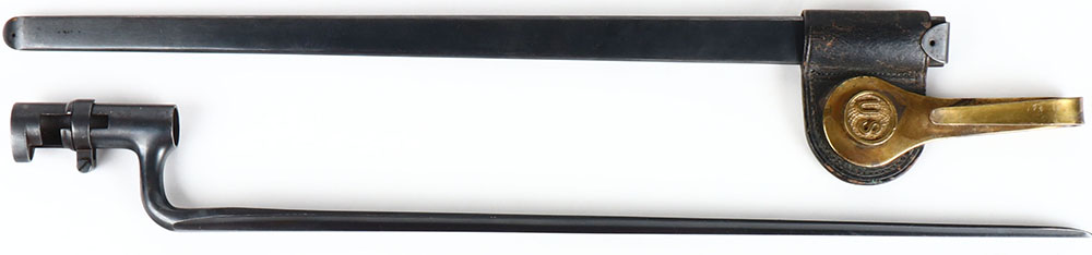US, M1873 socket bayonet for the trapdoor Springfield, bluing is almost entirely intact with little to no wear, blade is marked ''US'', ''S'', comes with sheath & frog. Grade: Excellent + - Value: 100 to 200