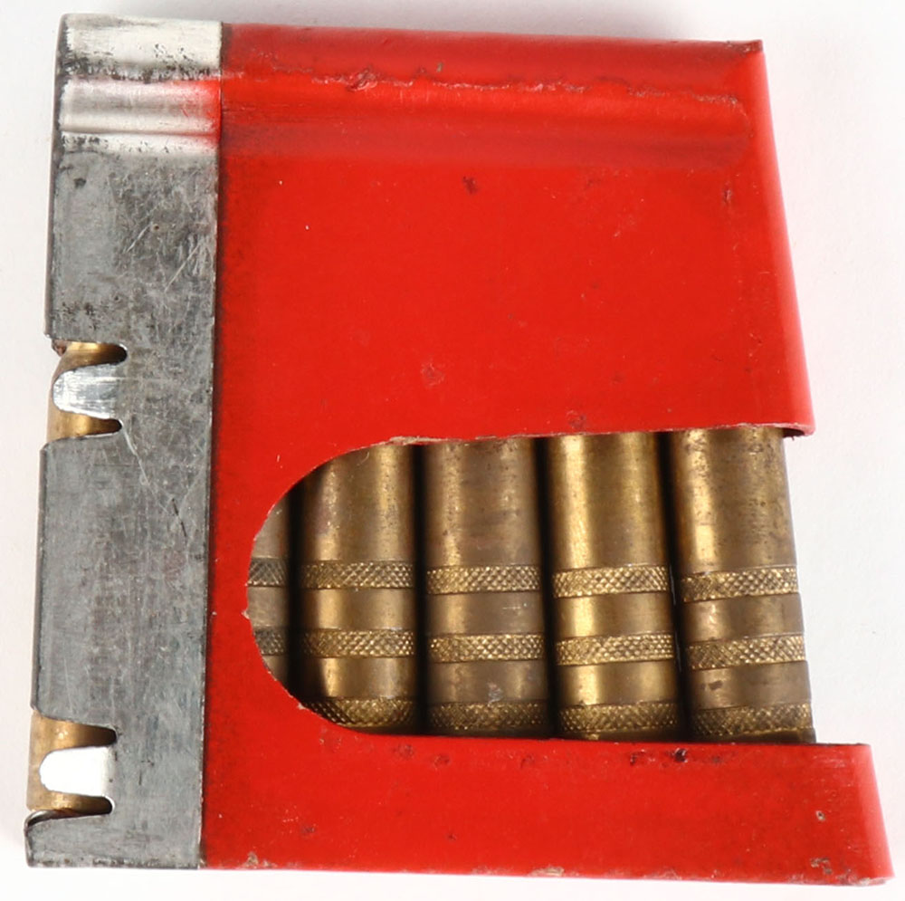Swiss, 5 Rds. Of Dummy 7.5 Swiss in the correct red color charger, the Swiss would have different color chargers to designate what ammo was in them & red was used for dummy's. Grade: Excellent - Value: 20 to 40