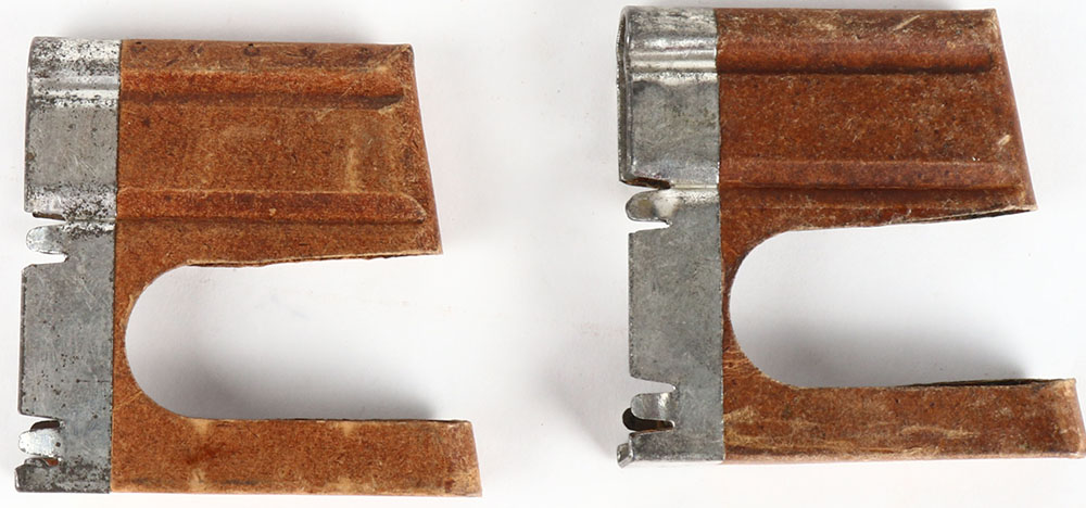 Lot of 2, brown Swiss 7.5mm chargers, the Swiss would have different color chargers to designate what ammo was in them & brown was used for standard military ball. Grade: Very Good ++ - Value: 20 to 40