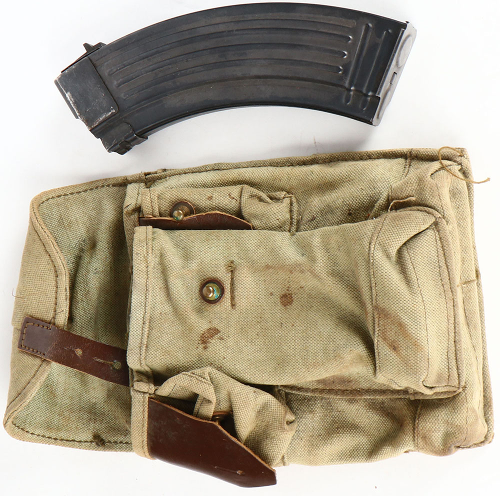 Russian, 3 cell, canvas, AK-47/AKM/AK-74 magazine pouch, has one small pouch for a oil bottle, & one smaller pouch for a cleaning kit. Faint illegible Russian marking on inside of flap, comes with one Chinese 30 Rd. flatback 7.62x39mm AK mag, pouch has stains & wear. Grade: Very Good + - Value: 20 to 60