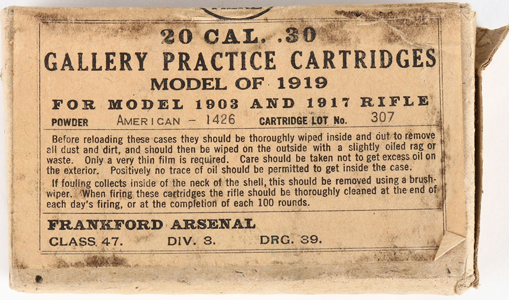 Frankford Arsenal, .30 model of 1919, Gallery practice Cartridges, Lot No. 307, 1921 dated, 1pc, FULL & SEALED, buff box & label with black print, box is solid with small partial tear on right end of box, age soiling, rub marks, handling wear, & light edge/corner wear. Grade: Very Good ++ - Value: 20 to 60
