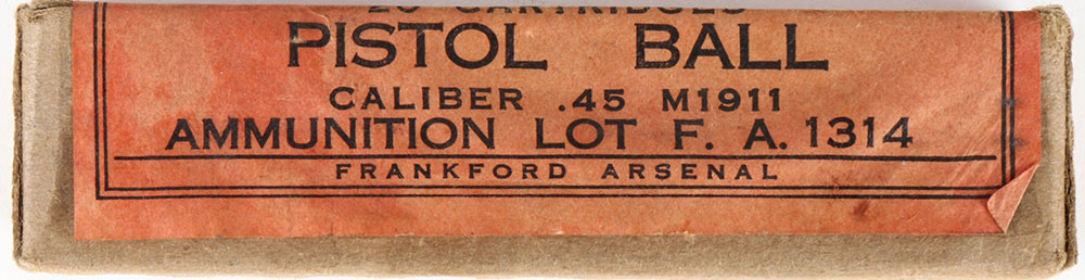 Frankford Arsenal, Cal. .45 M1911 Ball, Lot F.A. 1314, 1pc, FULL & SEALED, buff box with red label & black print, box is solid with pen marks, small areas of color fading, light age soiling, & light rub marks. Grade: Very Good ++ - Value: 20 to 40