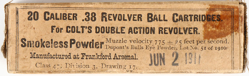 Frankford Arsenal, .38 Revolver Ball, for colt's double action revolver, dated June of 1911, 1pc, FULL & SEALED, buff box & label with black print, box is solid with tape, stains, light rub wear, light age soiling, & light edge wear. Grade: Very Good + - Value: 10 to 30