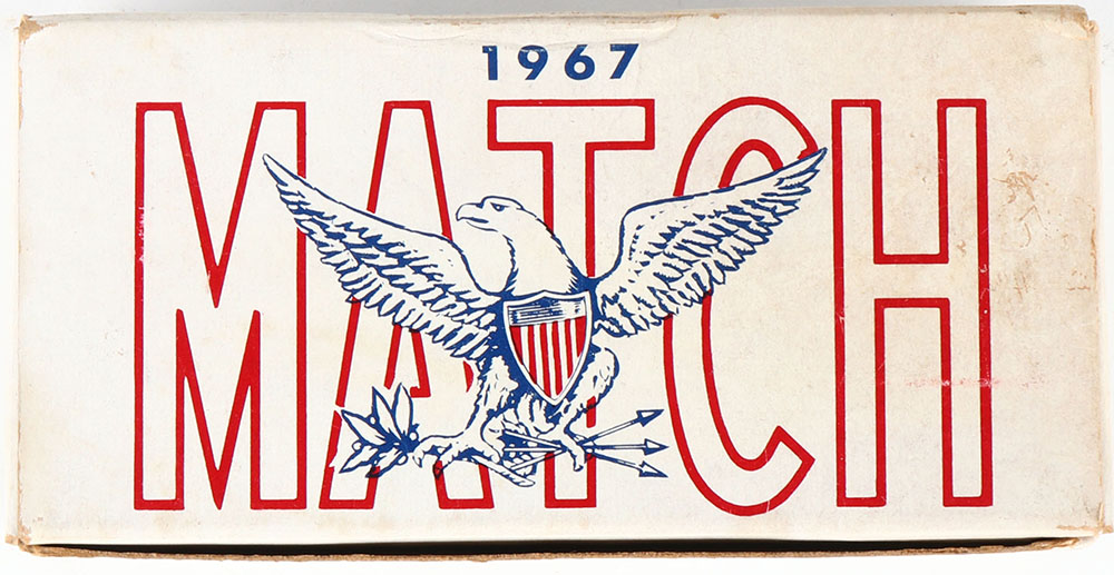 Olin, .45 M1911 Ball Match, 1967, 1pc, Full, white box with red/blue print, picture of eagle with American shield on top, box is solid with age soiling, light rub marks & edge wear. Ammo is excellent. Grade: Very Good ++ - Value: 30 to 60