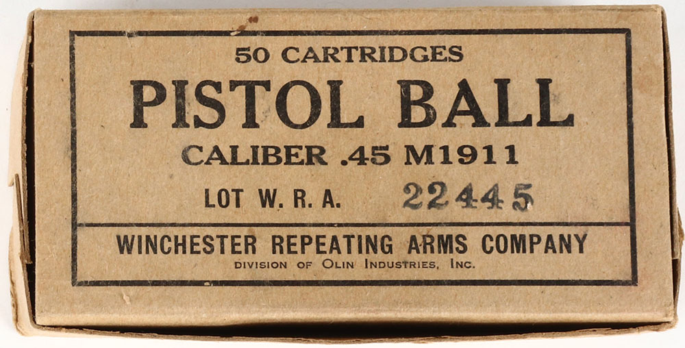 Winchester, .45 M1911 Ball, Lot W.R.A. 22445, 1pc, Full, brown box with black print, box is solid with light rub marks & light handling wear, ammo is very good. Grade: Excellent - Value: 30 to 60
