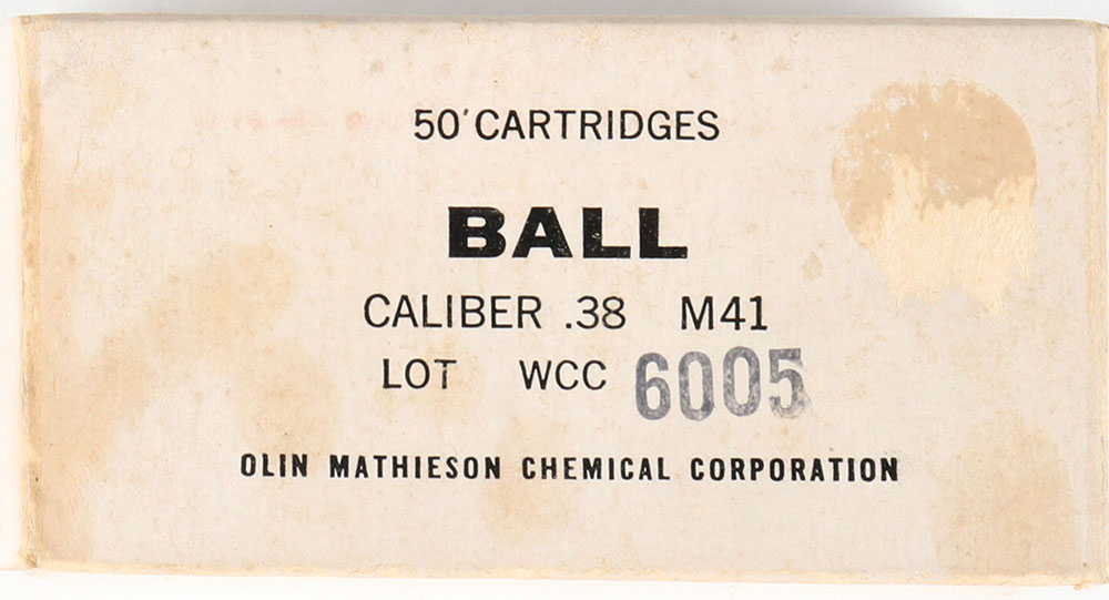Olin, .38 Special M41 Ball, Lot WCC-1-6005, 1pc, Full, white box with black print, box is solid with age soiling, light rub marks, & light edge wear, ammo is excellent. Grade: Very Good + - Value: 30 to 60