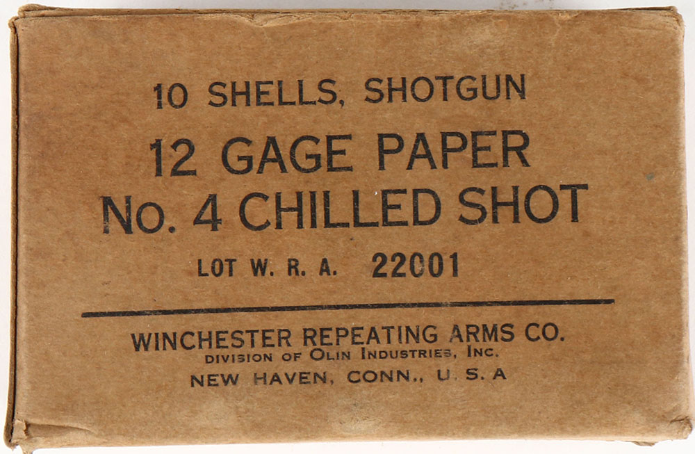 Winchester, 12 Ga, No. 4 Chilled shot, Paper shell, Lot W.R.A. 22001, 1pc, Full, buff box with black print, box is solid with stains, edge wear, light rub marks, & a partial torn seam on one inside flap, ammo is very good. Grade: Very Good + - Value: 10 to 30