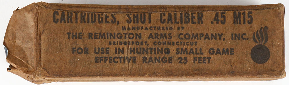 Remington, .45 M15 Shot, Lot RA 5001, instructions paper inside box, 1pc box with foil wrap, Full, buff box & foil with black print, foil is solid with age soiling & handling wear, one end of foil is opened, box is solid with very minor wear, ammo is very good. Grade: Excellent - Value: 10 to 30