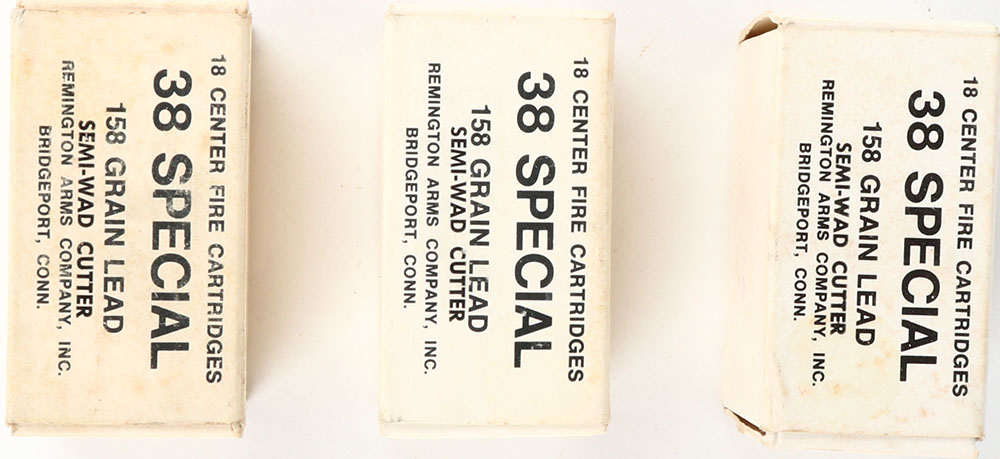 Lot of 3, Remington, .38 Special, 158 Gr. Lead Semi-Wad cutter, 1pc, all full, 54 Rds. total, boxes has light wear & age soiling, ammo is excellent. Grade: Excellent - Value: 40 to 80