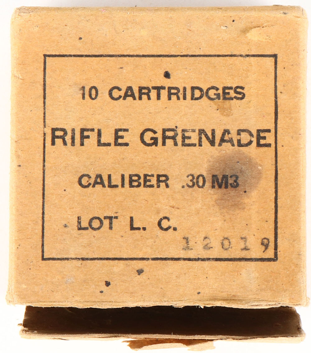 Lake City, .30 M3 Rifle Grenade Blanks, Lot L.C. 12019, 1pc, Full, brown box with black print, box is solid with stains, partial tear in bottom flap seam, rub marks & edge wear, ammo ranges from very good to good. Grade: Very Good + - Value: 20 to 40