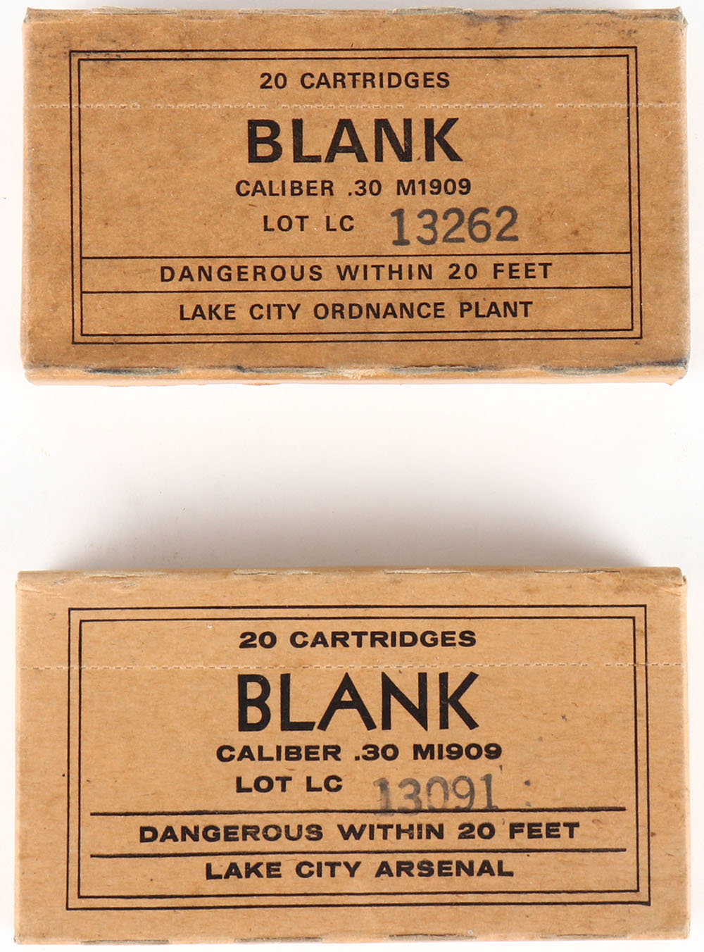 Lot of 2, Lake City, .30 M1909 Blanks, 1pc, both FULL & SEALED, boxes are solid with light rub wear & age soiling. Grade: Excellent - Value: 20 to 40