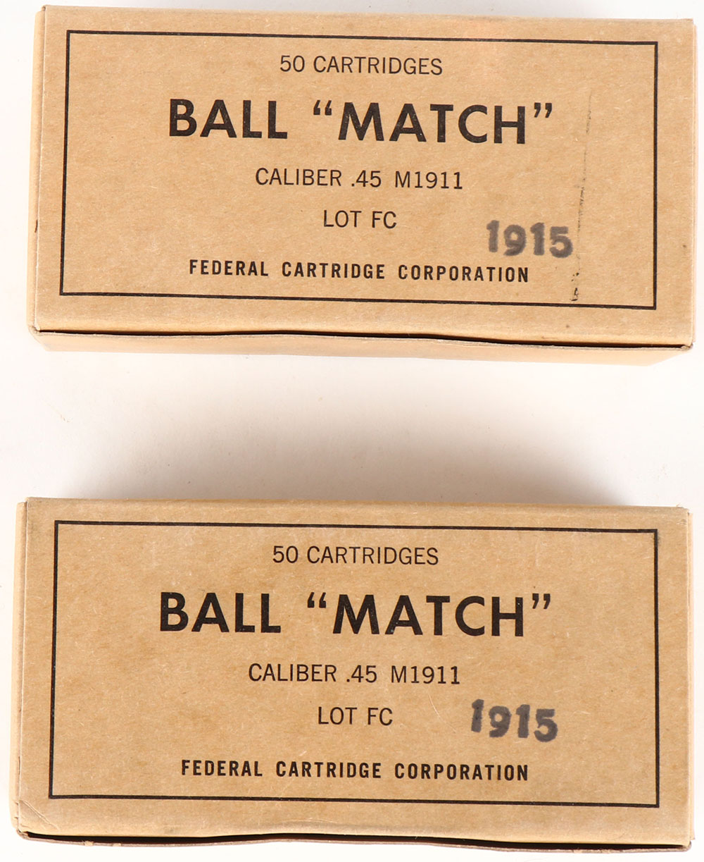 Lot of 2, Federal, .45 M1911 Ball Match, 1pc, both boxes Full, boxes are solid with minor wear, ammo is excellent. Grade: Excellent ++ - Value: 50 to 100