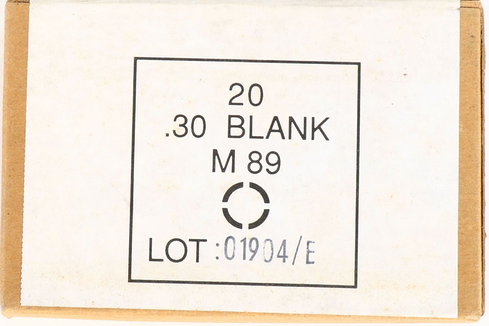 US, .30 M89 Blank, 30-06, Lot 01904/E, 1pc, Full, buff box with white label & black print, box is solid with light age soiling, ammo is excellent. Grade: Excellent - Value: 10 to 30