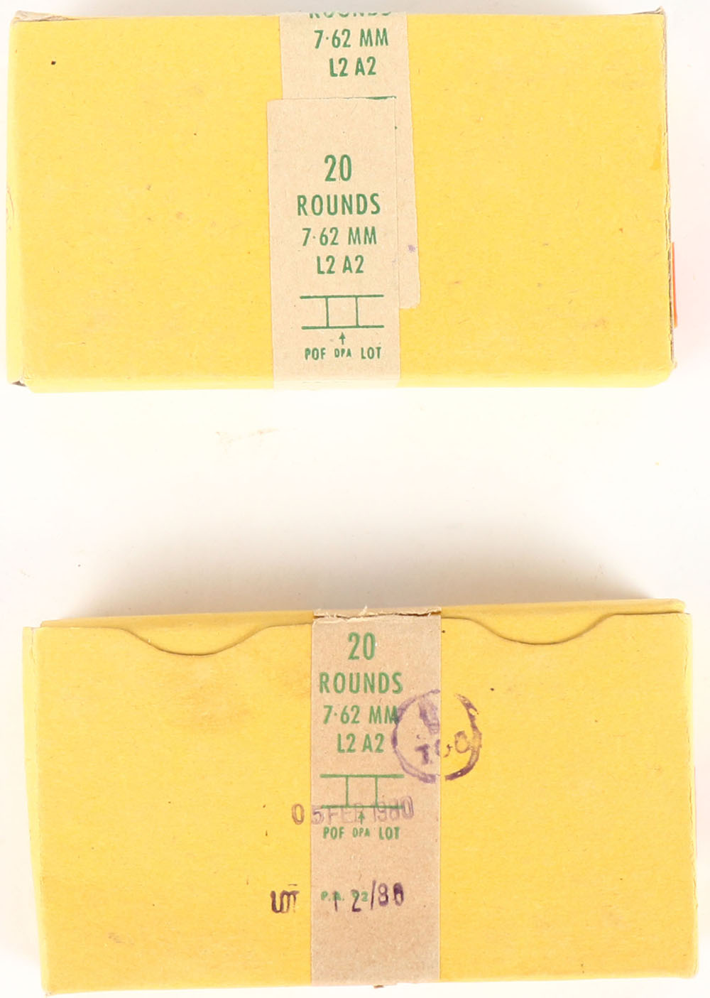 Lot of two, POF (Pakistan Ordnance Factories), 7.62mm L2 A2, 1980 dated, 1pc, Both Full, one SEALED, yellow box with buff label & green print, box's are solid with light rub wear, ammo is very good. Grade: Excellent - Value: 30 to 60