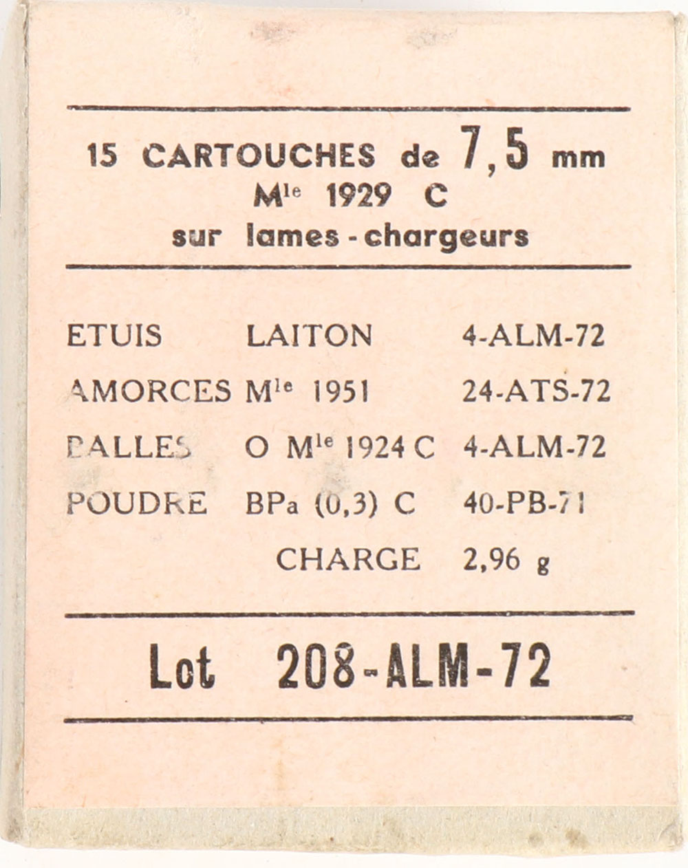 French, 7.5mm Mle 1929 C, 7.5x54mm French on clips, lot 208-ALM-72, 1pc, FULL & SEALED, buff box with pink label & black print, box is solid with light age soiling/rub marks. Grade: Excellent + - Value: 20 to 40
