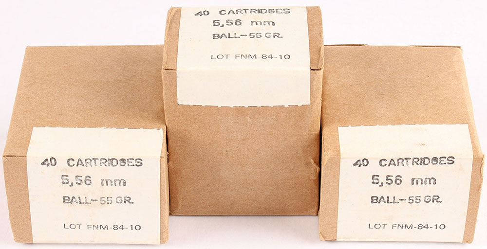 Lot of three, Portuguese, 5.56mm Ball, 55 Gr., 1984 dated, 1pc, Full, brown box with white label & black print, boxes are solid with light rub wear, ammo is excellent. Grade: Excellent - Value: 40 to 100