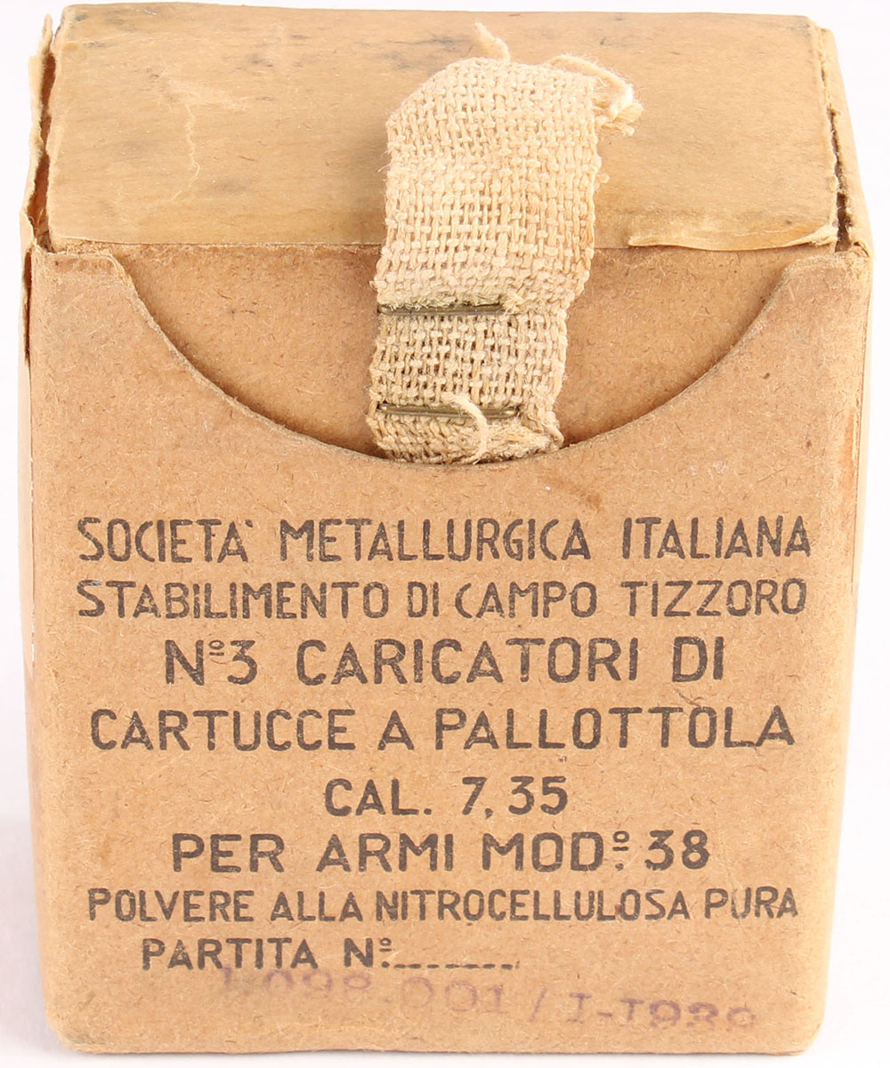 Societa Metallurgica Italiana, 7.35x51mm Carcano, 1939 dated, 1pc, Full, brown box with black print, box is solid with light age soiling, rub marks, & edge/corner wear, ammo is very good. Grade: Excellent - Value: 20 to 60