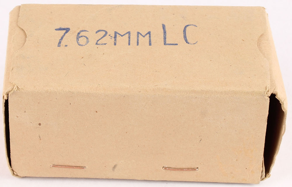 Chinese, 7.62mm (.30 Carbine) 50 Rd. Box, 1pc, Full, brown box with blue print, box is solid with light wear, ammo is excellent but is known to be Berdan primed & corrosive. Grade: Excellent - Value: 20 to 40