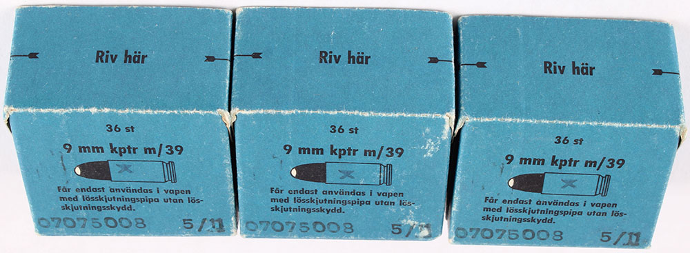 lot of 3, Swedish, 9mm kptr m/39 training ammo, CAUTION this is special training ammo that was used with guns with special barrel inserts, shooting this ammo in a standard gun chambered in 9x19mm will cause barrel damage, it is a composite bullet with a smaller steel ball bearing inside, when fired in a standard 9mm gun, the composite bullet with disintegrate and leave the ball bearing bouncing around In the barrel on its way out causing damage, only buy this ammo to collect not to fire, 1pc, FULL & SEALED, blue box with black print, boxes are solid. Grade: Very Good ++ - Value: 10 to 50