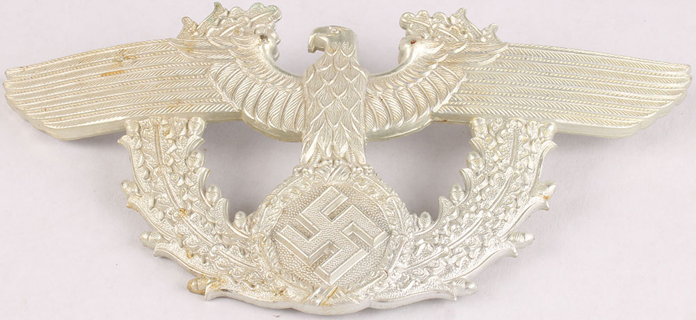 German, aluminum iron eagle Police Shako, marked ''C.T.D.'' on back. Grade: Very Good ++ - Value: 20 to 100