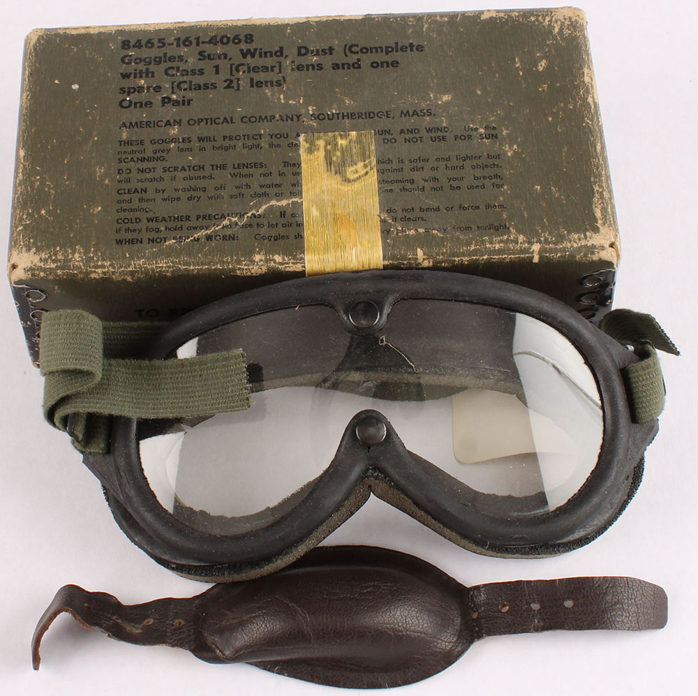 US, M44 Sun, Wind, & dust Goggles, comes with all original accessions, two extra lens with leather chin strap, box has rub marks & edge wear. Grade: Very Good + - Value: 20 to 60